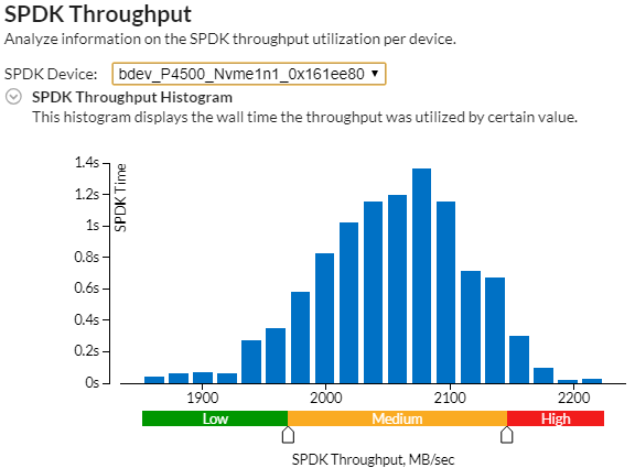 SPDK スループット分布図と表を調査して、選択した SPDK デバイス全体でワークロードの利用率が低下している時間帯を特定します (低い 利用率レベル)。