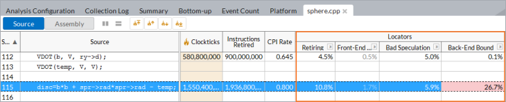 それぞれのメトリックは、インテル® アーキテクチャーで定義されているイベント比率で、固有の事前定義されたしきい値を持っています。インテル® VTune™ プロファイラーは、それぞれのプログラム単位 (関数など) で収集された比率値を解析します。この値がしきい値を超え、プログラム単位の CPU 時間が収集された CPU 時間全体の 5% を上回ると、潜在的なパフォーマンスの問題につながるため、その値はピンク色で強調表示されます。