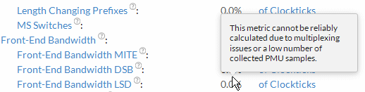 灰色で表示されるメトリック値は、このメトリックで収集されたデータの信頼度が低いことを表します。これは、収集された PMU イベントのサンプル数が非常に少ないことなどが原因です。このような信頼度の低いメトリック値にカーソルを移動すると、インテル® VTune™ プロファイラーは次のようなメッセージを表示します。