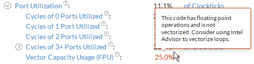 各メトリックにはしきい値があります。メトリック値がしきい値を超えるプログラム単位はホットスポットであり、インテル® VTune™ プロファイラーはパフォーマンス・クリティカルであるとして、その値をピンク色でハイライト表示します。ピンク色の各セルの上にマウスを移動すると、問題の説明と推奨される解決策 (ある場合) が表示されます。