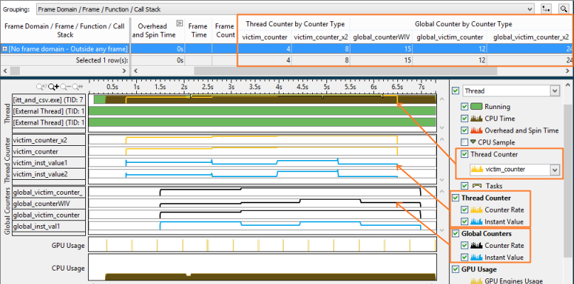 スレッド固有およびグローバル (スレッド固有ではない) の両方の離散累積カウンター値が、グリッドビューと [タイムライン] ペインに黄色で表示されます。スレッド固有およびグローバルの瞬間カウンター値は、[タイムライン] ペインにのみ青色で表示されます。