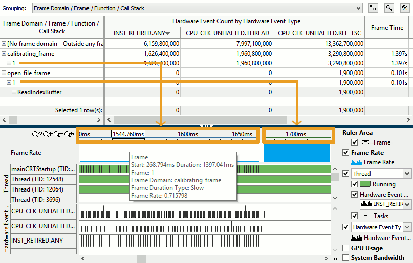 インテル® VTune™ プロファイラーを使用すると、[タイムライン] ペインと [グリッド] ビューでフレームデータを容易に関連付けることができます。