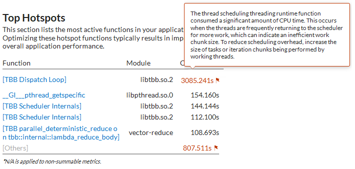 アイドルまたは低い CPU 利用率で大部分の経過時間が費やされている場合、[上位のホットスポット] のリストを調査してください。フラグ付きの oneTBB 関数は、スケジュールのオーバーヘッドやインバランスなど非効率な並列処理により、アプリケーションが oneTBB のランタイムで CPU 時間を費やしている可能性があることを意味します。理由を確認するにはフラグにカーソルを移動します。