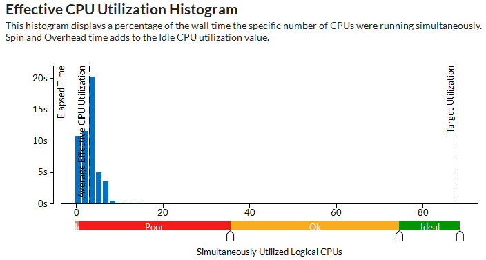 ホットスポット解析で oneTBB の並列化効率の調査を始めます。アプリケーションの並列化レベルを見るには、[効率良い CPU 利用率の分布図] を確認します。分布図は、スレッドランタイムで費やされた時間を差し引いた有効時間を基に、アプリケーションの並列化レベルを示すことに注意してください。