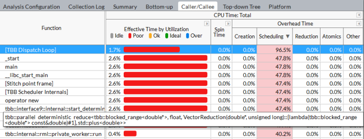 例えば、高いスケジュール値を持つ oneTBB ランタイム関数は、アプリケーションがスレッドのワークを細かく分割していることを示している可能性があります。これは、アプリケーションがランタイムを呼び出す際に過度のスケジュール・オーバーヘッドの原因となります。この問題はスレッドのチャンクサイズを増やすことで回避できます。