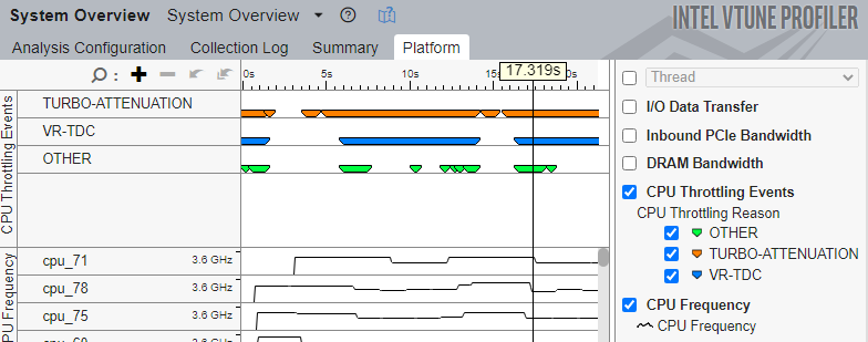 [プラットフォーム] ウィンドウに切り替えると、スロットリング・イベントの原因別の内訳が表示されます。