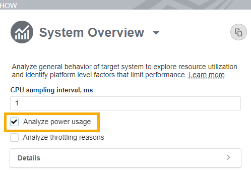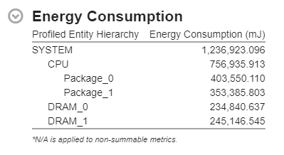 また、システムの概要解析を使用して、ソケットおよび DRAM モジュールごとの電力使用量の内訳と、システムの電力使用量データを取得することもできます。