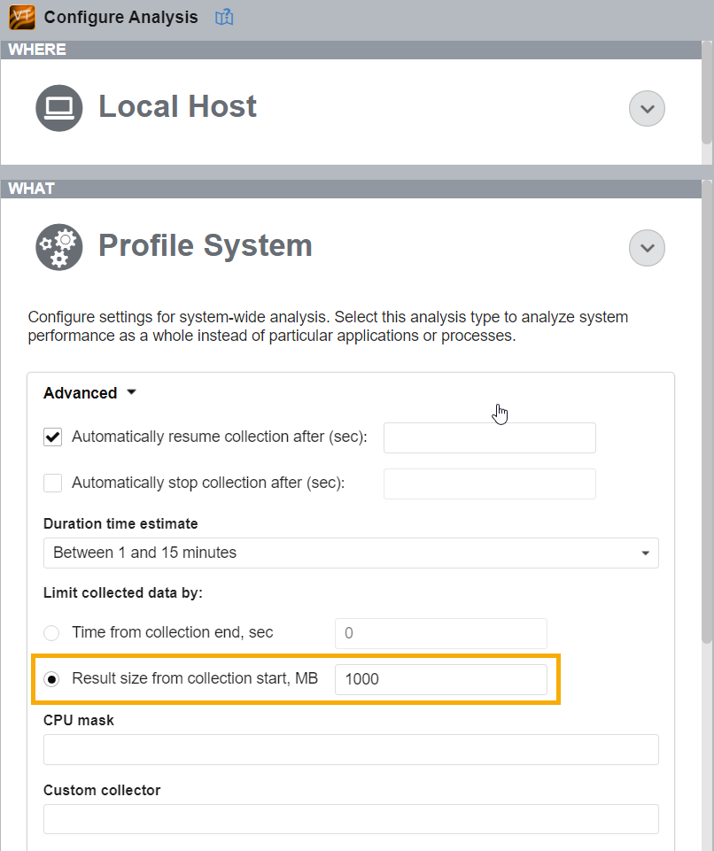 デフォルトの [ハードウェア・トレース] 設定では、インテル® VTune™ プロファイラーは 1GB の上限に達するとデータの収集を停止します。この制限は、[何を] ペインの [高度] セクションで変更できます。