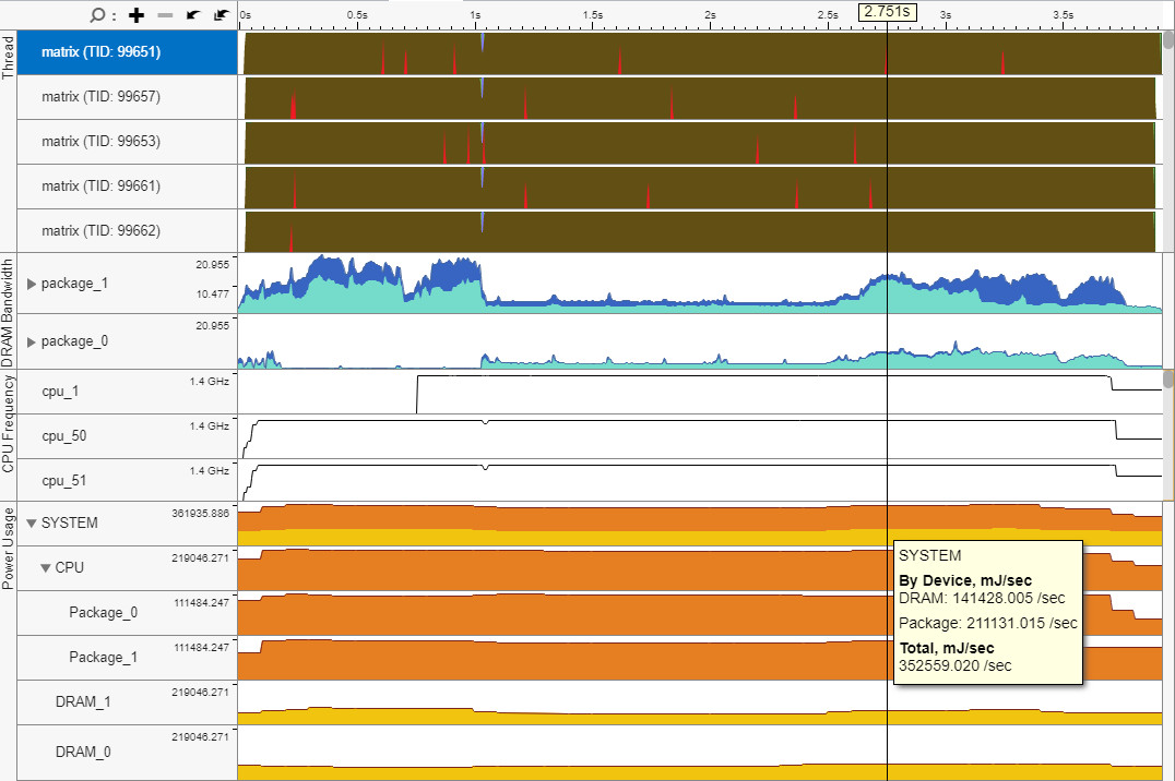 [プラットフォーム] ウィンドウに切り替えると、消費電力を時系列で見ることができます。DRAM 帯域幅、CPU 周波数、CPU 利用率など各種メトリクスと、各デバイスが消費する電力量を関連付けます。