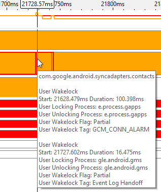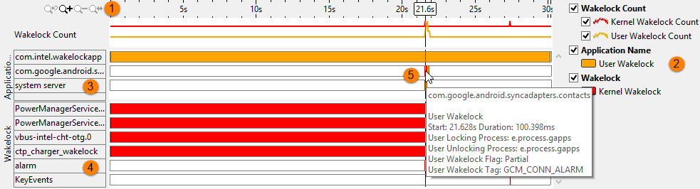 ウェイクロックの詳細 | アプリケーションのタイムラインにカードルを移動すると、ウェイクロックの種類、開始時間、持続時間、ロックとロックを解除するプロセス名、およびアプリケーション名を示すポップアップが表示されます。 カーネル・ウェイクロックのタイムラインにカードルを移動すると、ウェイクロックの種類、開始時間、持続時間、ロックとロックを解除する原因、およびロックするプロセス示すポップアップが表示されます。 タイムラインをズームすると、ウェイクロックが開始された正確な時間と解放された時間が表示されます。ウェイクロックが別のウェイクロックの前に開始され、オーバーラップを引き起こす可能性があります。 ![]() |