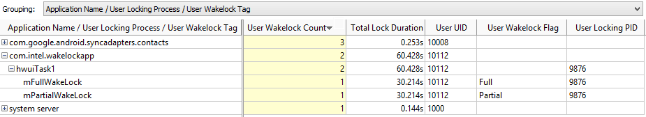 次の例では、2 つのウェイクロックが、com.intel.wakelockapp APK で発生しました。