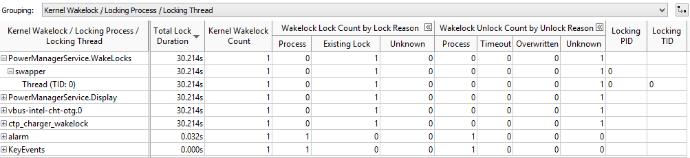 ボタンをクリックしてカラムを展開し、各デバイスの異なるウェイクロック・オブジェクトを表示します。デフォルトでは、表は [カーネル・ウェイクロック/ロックするプロセス/ロックするスレッド] グループで昇順にソートされ、ロック持続時間の合計が最も大きいオブジェクトが一番上に表示されます。データセルを右クリックして、[データを表示] オプションで代替単位を選択して表示する単位を変更できます。