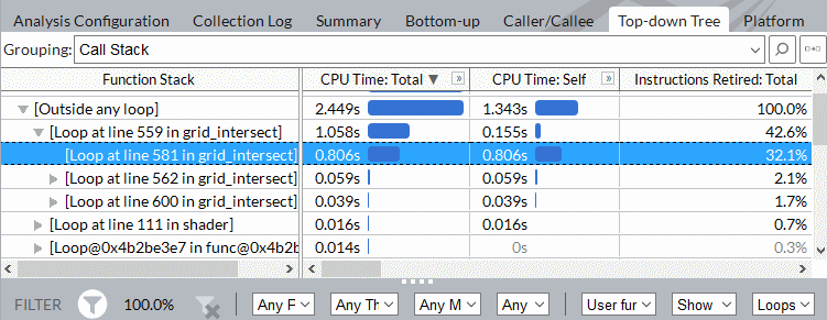 最も重い上位レベルのループを特定するには、[トップダウン・ツリー] ウィンドウに切り替えます。グリッド内のデータは、最も時間のかかる最上位のループから合計時間のメトリックでソートされます。