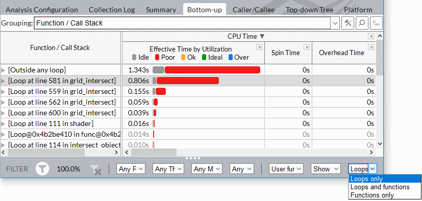 最も時間を消費するループを特定するには、[ボトムアップ] ウィンドウで [ループのみ] モードを選択します。デフォルトでは、最も高い CPU 時間値を持つループがグリッドの上位に表示されます。