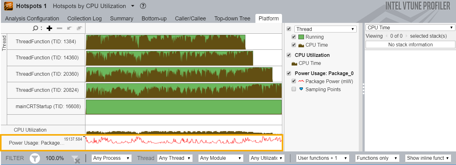 [スナップショット] ビューでインテル® VTune™ プロファイラーの解析タイプを実行すると、パッケージの消費電力を時系列で観察できます。このオプションは、Windows*、Linux*、および Android* システムでインテル® VTune™ プロファイラーを実行する際に使用できます。