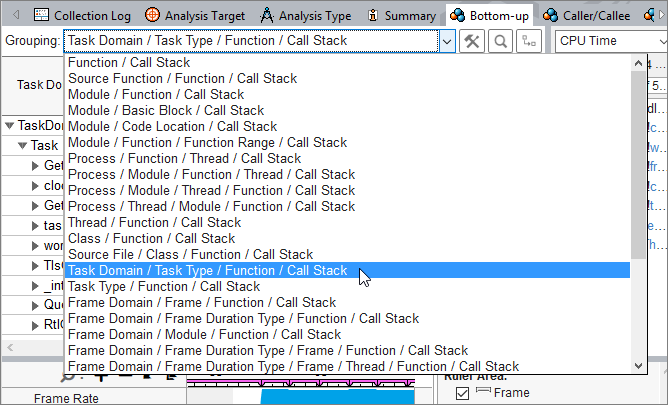 [グリッド] ビュー: [グループ化] を [タスクドメイン / タスクタイプ / 関数 / コールスタック] または [タスクタイプ / 関数 / コールスタック] に 設定し、[グリッド] ペインにタスクデータを表示します。