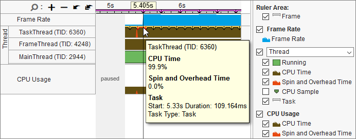 [タイムライン] ビュー: それぞれの API タイプは、[タイムライン] ビューでは異なる表示となります。例えば次の例では、コードはタスク API 、フレーム API、イベント API および収集制御 API でインストルメントされています。タスクは、タスクスレッドでイエロー (黄色) のバーで表示されます。フレームは、ピンク (桃色) でタイムラインの上部に表示されます。イベントは、イベント発生時に対応するスレッドに三角形で表示されます。収集制御イベントはタイムライン全体に表示されます。タスク、フレーム、またはイベントにカーソルを移動すると、API タスクのタイプが表示されます。