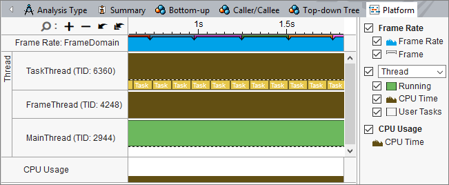 インテル® VTune™ プロファイラーのパフォーマンス解析結果では、ユーザータスクと API データを視覚化できます。