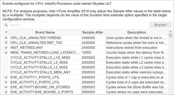 カスタム設定に新しいイベントを追加するには、表中のイベントを選択して説明を調べるか、[説明] ボタンをクリックして「インテル® プロセッサー・イベントのリファレンス」を開きます。