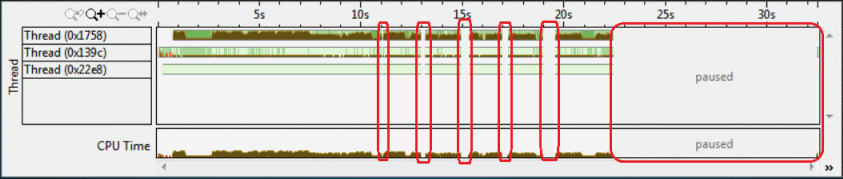上記の例では、アプリケーションはおよそ 22 秒の位置で __itt_pause() を呼び出しています。しかし、インテル® VTune™ プロファイラーによってもう 1 つ短いポーズが挿入されています。インテル® VTune™ プロファイラーは、データの生成率がスピル率を超えてデータが損失しそうになると、一時的にプロファイルを中断して、データがフラッシュされ、その後収集が再開されます。ポーズ領域では、アプリケーションは実行していません。インテル® VTune™ プロファイラーは、アプリケーションが現在の定量を使い切ってすべてのデータがファイルに保存されるまで CPU 上にスケジュールしません。