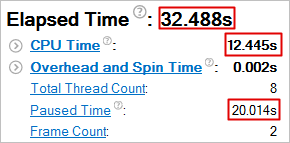 挿入されたポーズ時間は無視できます。例えば、次のサマリー情報では、ポーズ時間は経過時間の一部であることが分かりますが、これには CPU 時間は含まれません。