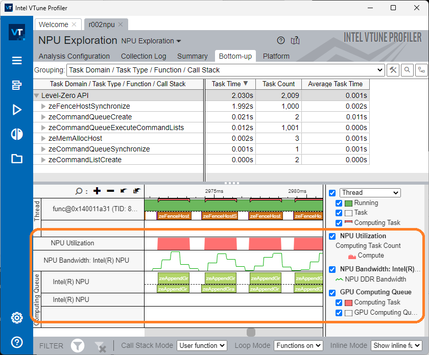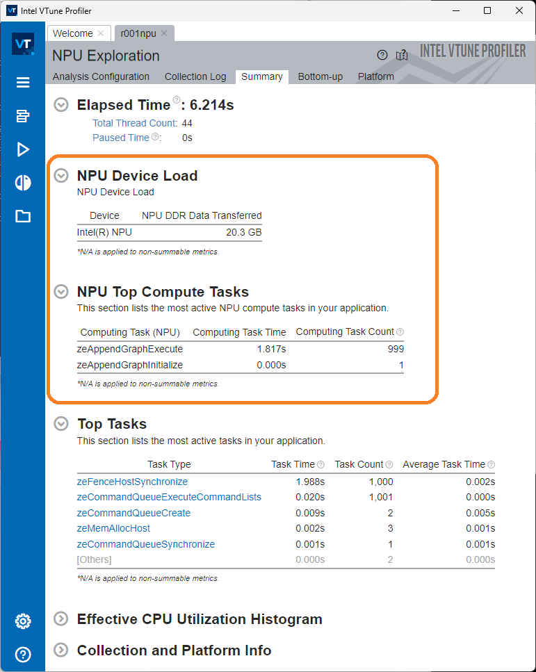 [サマリー] ウィンドウには、次のセクションから始まる NPU パフォーマンス・データが表示されます。